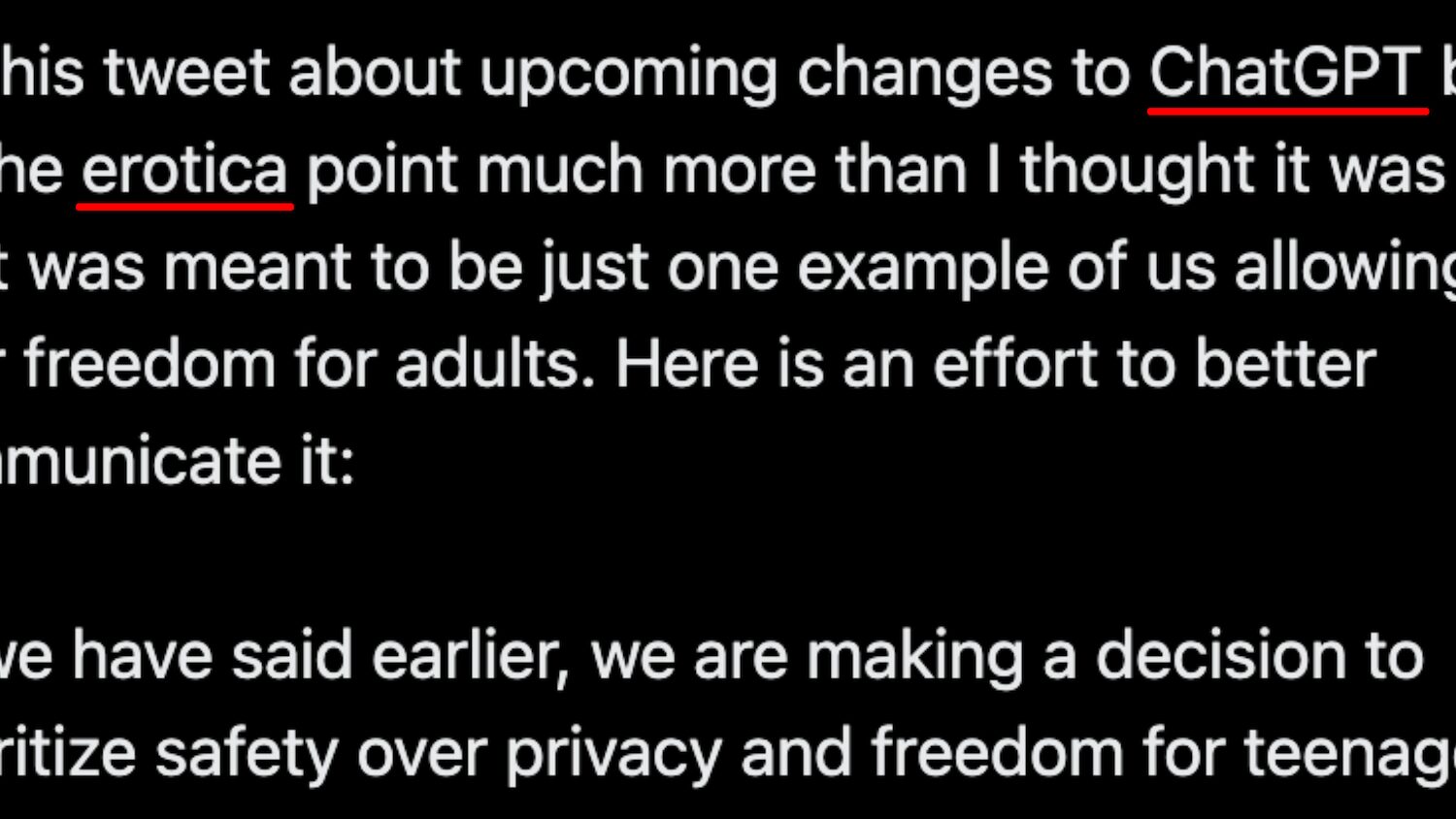 Ok this tweet about upcoming changes to ChatGPT blew up on the erotica point much more than I thought it was going to! It was meant to be just one example of us allowing more user freedom for adults. Here is an effort to better communicate it:
